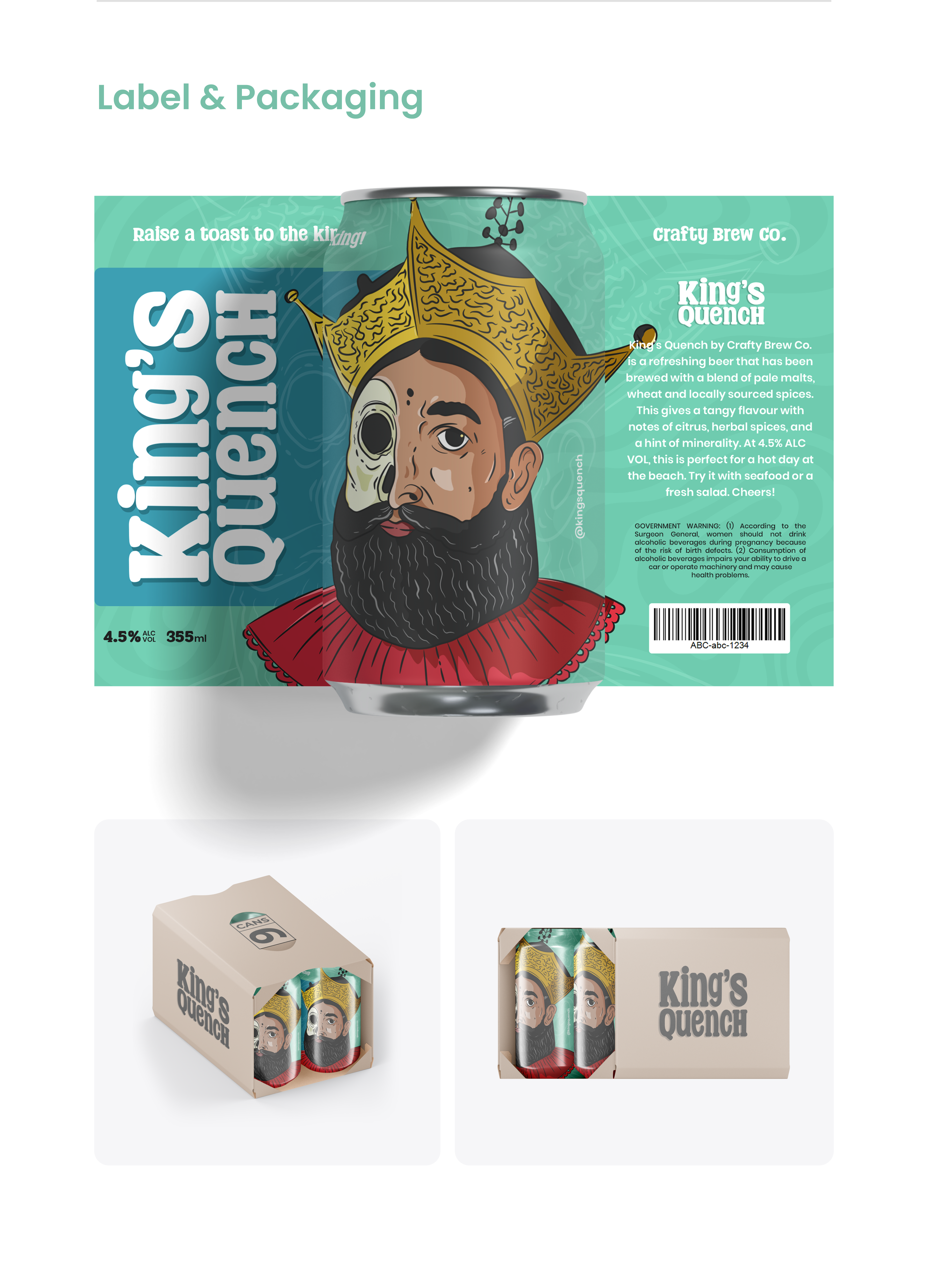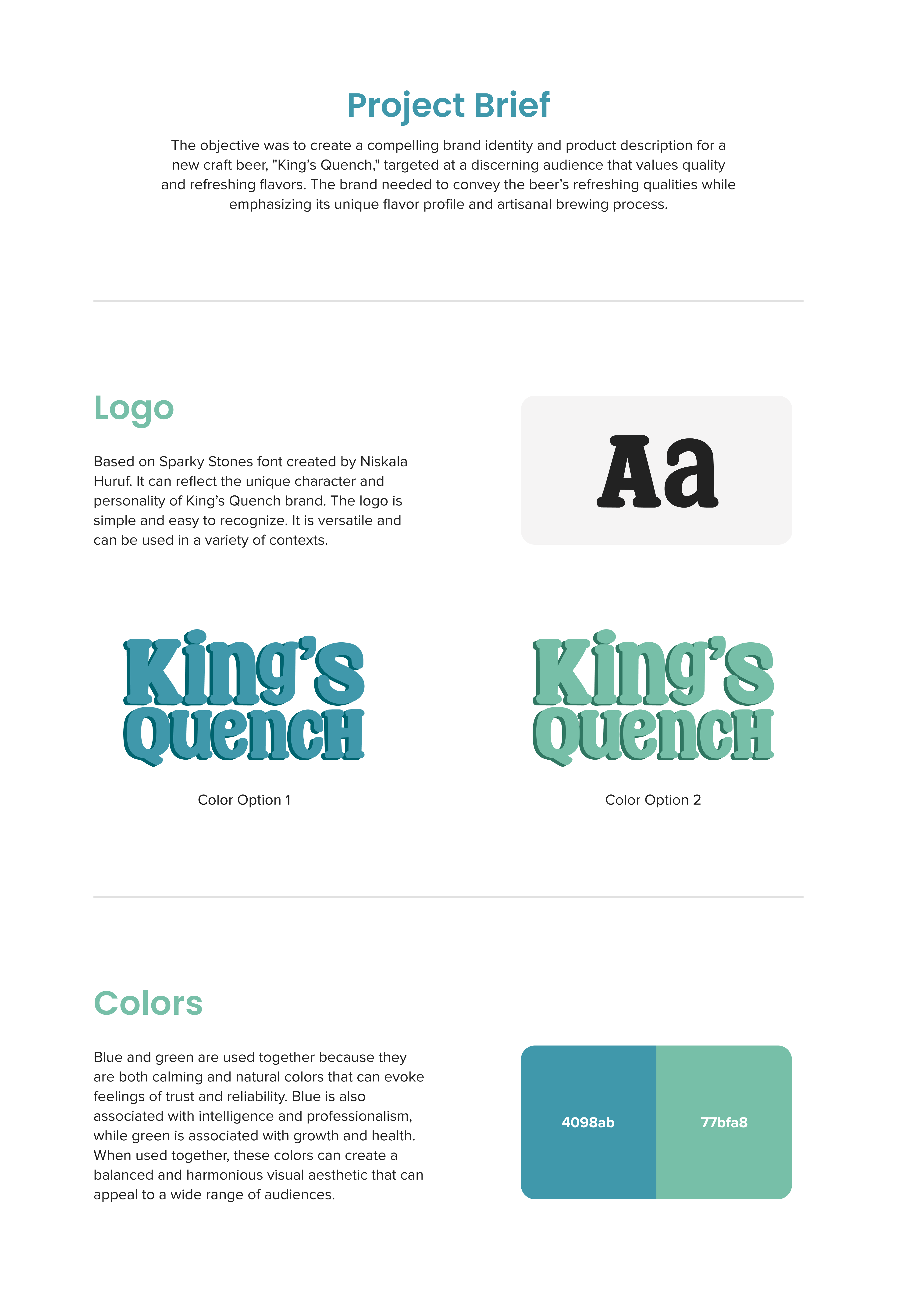 The objective was to create a compelling brand identity and product description for a new craft beer, "King’s Quench," targeted at a discerning audience that values quality and refreshing flavor.